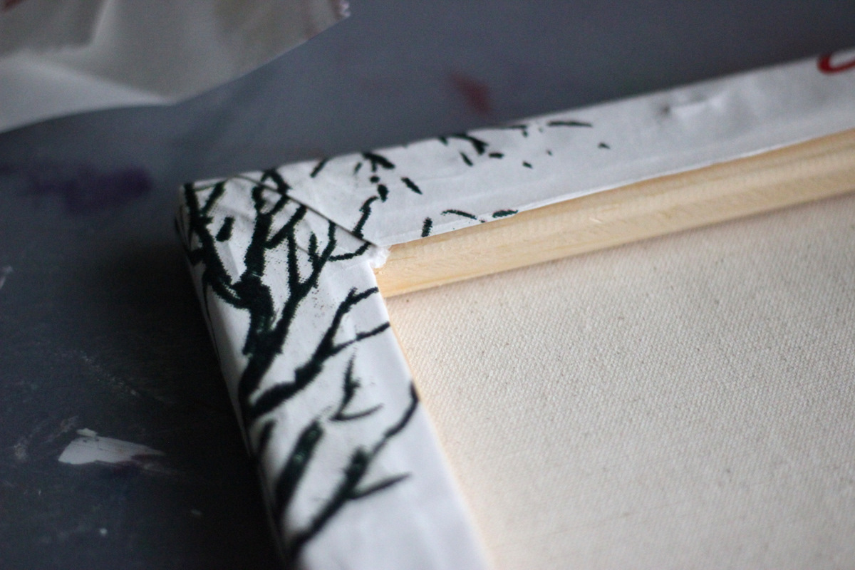 Here's another image of folding the sides of the canvas. This was my second canvas, which had a different type of backing. There was a nice groove where the canvas met the frame, so I decided to trim the edge of the paper at the groove instead of covering all the wood on this canvas.